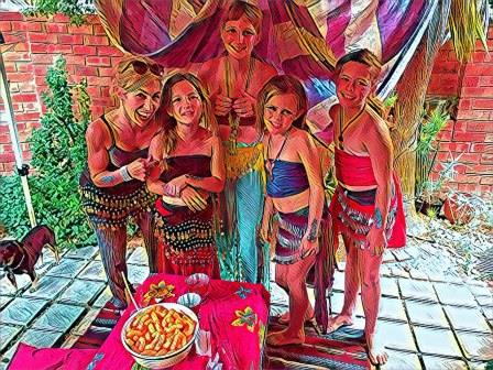 Prisma filter photo: Jasmine party - girls sitting at table on ground
